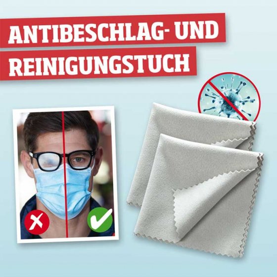 Kaum wird es draußen kälter, beschlagen bei jedem Wechsel ins Warme Brillengläser, Kamera-Objektive und Smartphone-Linsen. Schluss damit! Das ANTIBESCHLAG- UND REINIGUNGSTUCH sorgt schneller wieder für eine saubere, klare Sicht und wirkt erneutem Beschlagen über Stunden entgegen. Die molekulare Struktur des Tuches reduziert die Oberflächenspannung und absorbiert die Wassermoleküle in der Atemluft. In Zeiten, in denen das Tragen von Mund-Nasen-Masken zum Alltag gehört, wissen insbesondere Brillenträger diesen Effekt zu schätzen. Das Tuch kann aber noch viel mehr: Dank der zertifizierten ViralOff®-Beschichtung neutralisiert es laborgeprüft auch Viren auf der Glasoberfläche. Maße (L x B): ca. 15 x 15 cm. Material: Polyester, silberchloridbeschichtet. Behalten Sie den Durchblick – und geben Sie Viren keinen Platz!