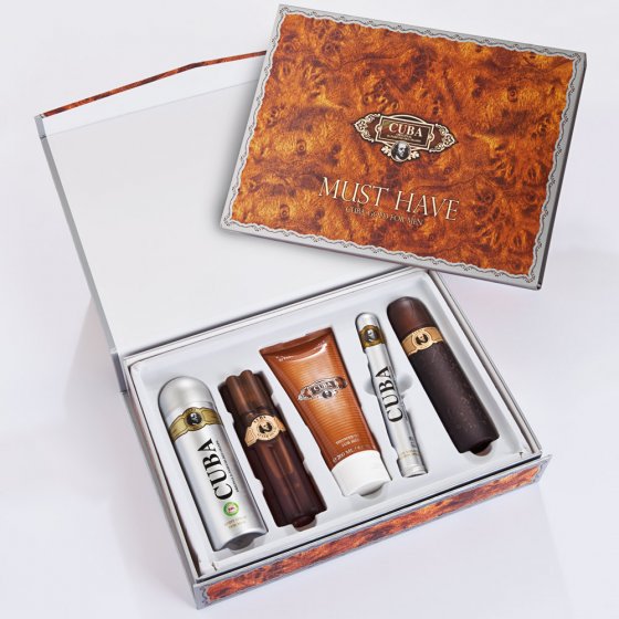 Mit dem HERRENDUFT GESCHENKSET „CUBA“ beweisen Sie garantiert „den richtigen Riecher“ – denn noch nie hat sich der beliebte Duft „Made in France“ so beeindruckend und vielfältig gezeigt! Das maskulin-würzige Eau de Toilette präsentiert sich im Glas-Flakon in Form einer rassigen Cuba-Zigarre (Inhalt 100 ml). Hinzu kommt die Reisegröße im elegant-schmalen Glas-Flakon (ca. 35 ml), umhüllt von einer „echten“ Metall-Zigarrenhülse. Duschgel (200 ml), After Shave (100 ml) und Deospray (200 ml) runden die Duftkreation auf vollendete Weise ab. Ob im Bad, im Kulturbeutel oder wohl riechend auf der Haut – dieses Geschenk hinterlässt bleibenden Eindruck und verwöhnt den Mann von Kopf bis Fuß!