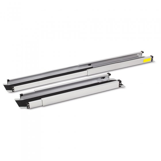 Treppenstufen, Türschwellen und hohe Schwellen können das Bewegen oder Einladen von Rollstühlen erschweren. Die leichtgewichtige Rollstuhlrampe ist ideal für zu Hause und unterwegs. Sie ist bis zu 270 kg belastbar und einfach zu montieren. Für den Transport lässt sie sich mit wenigen Handgriffen zusammenschieben. 2er-Set. Material: Aluminium. Farbe: Silber, Schwarz. Gewicht: 6,4 kg (2 Stück). Maße (Spur; Länge): 15 cm; 1,52 m, 79 cm (zusammengeschoben). Kommt in praktischer Tragetasche.