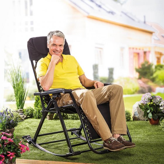 Komfortabel ruhen, im privaten Außenbereich, wie auf Reisen: Mit diesem Schaukelstuhl genießen Sie pure Entspannung. Seine ergonomische Form sorgt für eine schonende Körperhaltung und lässt Sie neue Kraft tanken. Mittels ausklappbarer Stellfüße verwandelt sich der Schaukelstuhl auch im Handumdrehen in eine geruhsame Liege oder einen Gartenstuhl – perfekt für Garten, Balkon oder Camping. Platzsparend zusammenklappbar (ca. 64 x 22 x 110 cm), wartet er nach Gebrauch auf seinen nächsten Einsatz. Maße (L x B x H): ca. 177 x 67 x 118 cm. Material: Kunststoff, Metall, Bezug aus 100 % Polyester. Belastbar bis max. 120 kg. Erhältlich in schwarz und apfelgrün.