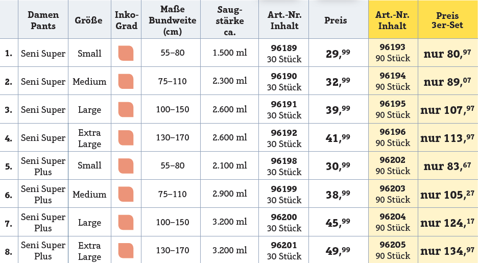 Die Seni Super Inkontinenzhosen bieten einen bewährten und zuverlässigen Schutz bei mittlerer bis schwerer Harn- sowie Stuhlinkontinenz. Dank des elastischen Bundes an Vorder- und Rückseite sowie der vier elastischen Klettverschlüsse passen sie sich optimal dem Körper an. Der seitliche Auslaufschutz und das integrierte Feuchtigkeitsverteilungssystem sorgen für einen wirksamen Schutz vor dem Austreten von Flüssigkeit. An- und Ausziehen, ohne die Hosen vollständig auszuziehen – einfach und praktisch!